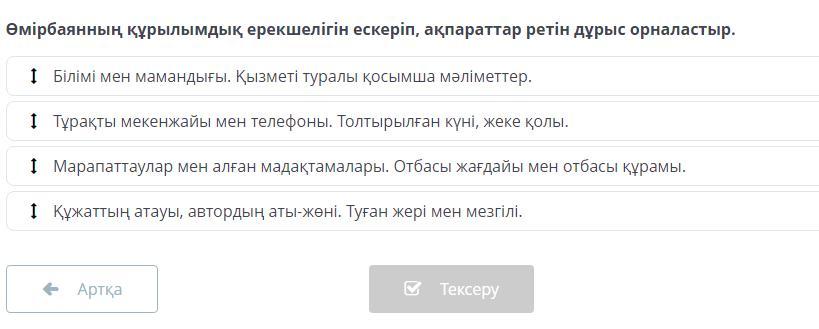 Өмірбаянның құрылымдық ерекшелігін ескеріп, ақпараттар ретін дұрыс орналастыр.