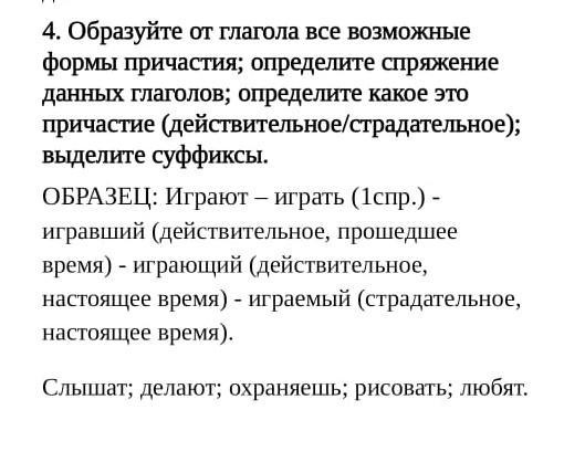 Образуйте от глагола все возможные формы причастия; определите спряжение данных глаголов; определите какое это причастие (действительное/страдательное); выделите суффиксы. ОБРАЗЕЦ: Играют - играть (1спр.) - игравший (действительное, прошедшее время) - играющий (действительное,