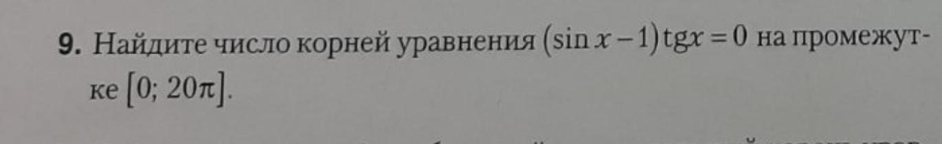 Найдите число корней уравнения (sinx -1)tgx = 0 на промежутке [0; 20П]. Ответ должен получиться 21 или 31. Только с объяснением. Срочно!!!! Даю 100б.