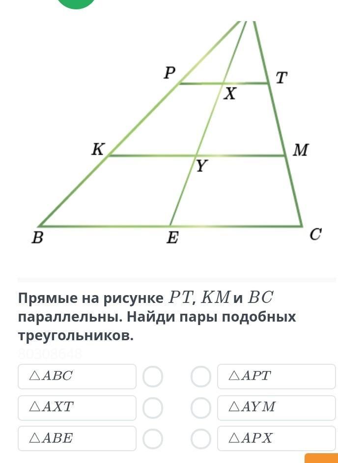 Прямые на рисунке РТ ,КМ и ВС параллельны. Найдите пары подобных треугольника