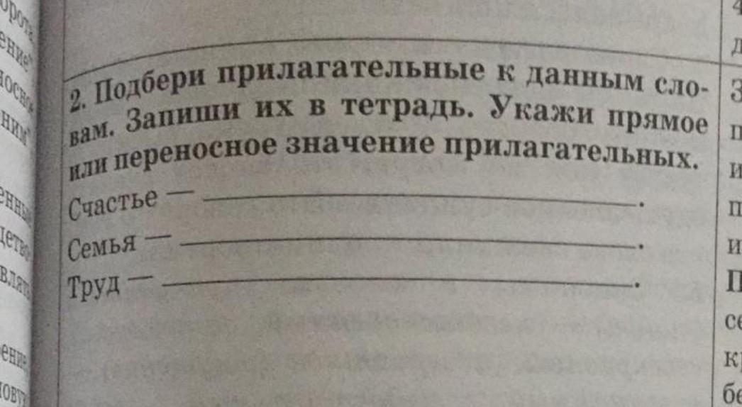 счастье -счастливый ,семья -семейный ,труд -трудный /трудолюбивый .