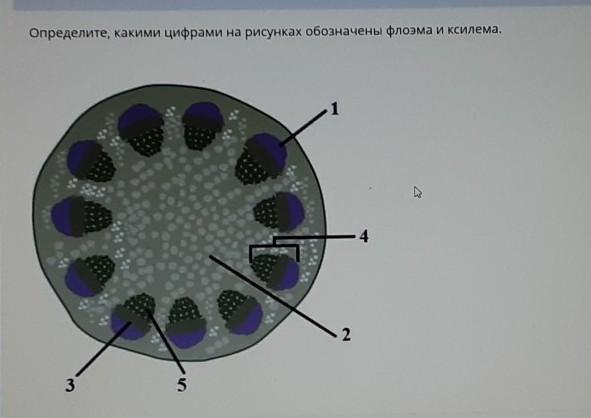 Определите, какими цифрами на рисунках обозначены флоэма и ксилема.