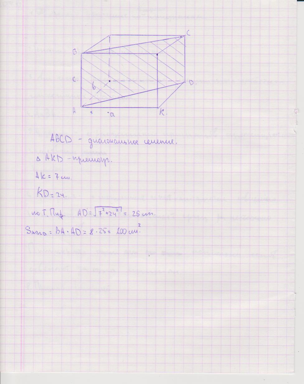 дан прямоугольный параллепипед где а-7 см, в-24 см, с-8 см, построить диагональное сечение и найти площадь этого сечения