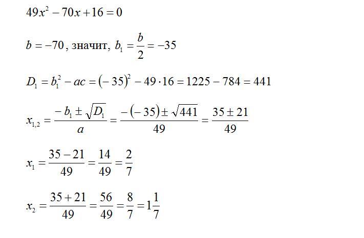 49x^2-70x+16=0, b=-70, значит, b1=b/2=-35