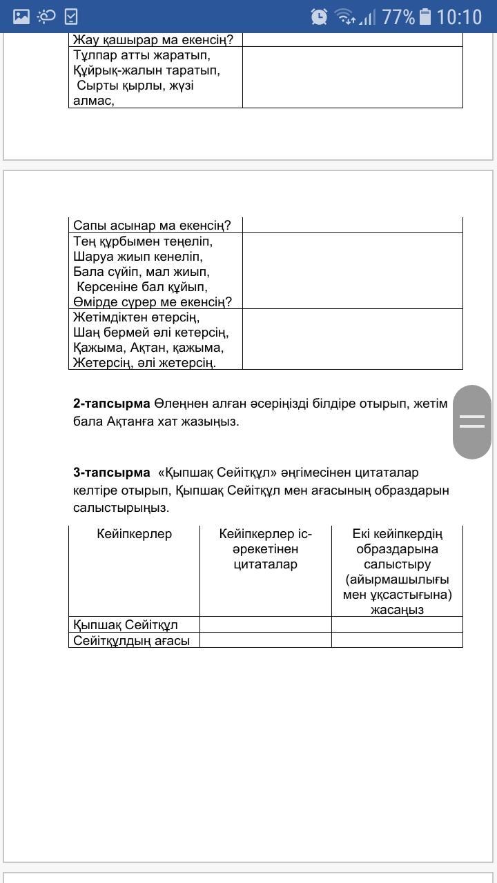 Сейітқұлдың ағасының іс әрекетіндегі цитаталар: інісінің қанша айтқан ақылына болмай, үш-төрт үймен жалғыз-ақ сол көшпей, ескі орны Түркістан жағында қала берді. Екі кейіпкердің образына салыстыру ( айырмашылығы мен ұқсастығы): Сейітқұл елін мен жерді ойлайды. Сейітқұлдың ағасы өзін ғана ойлайды.