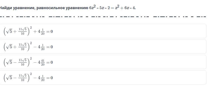 найди уравнение, равносильное уравнению 6x^2-5x-2=x^2+6x-4