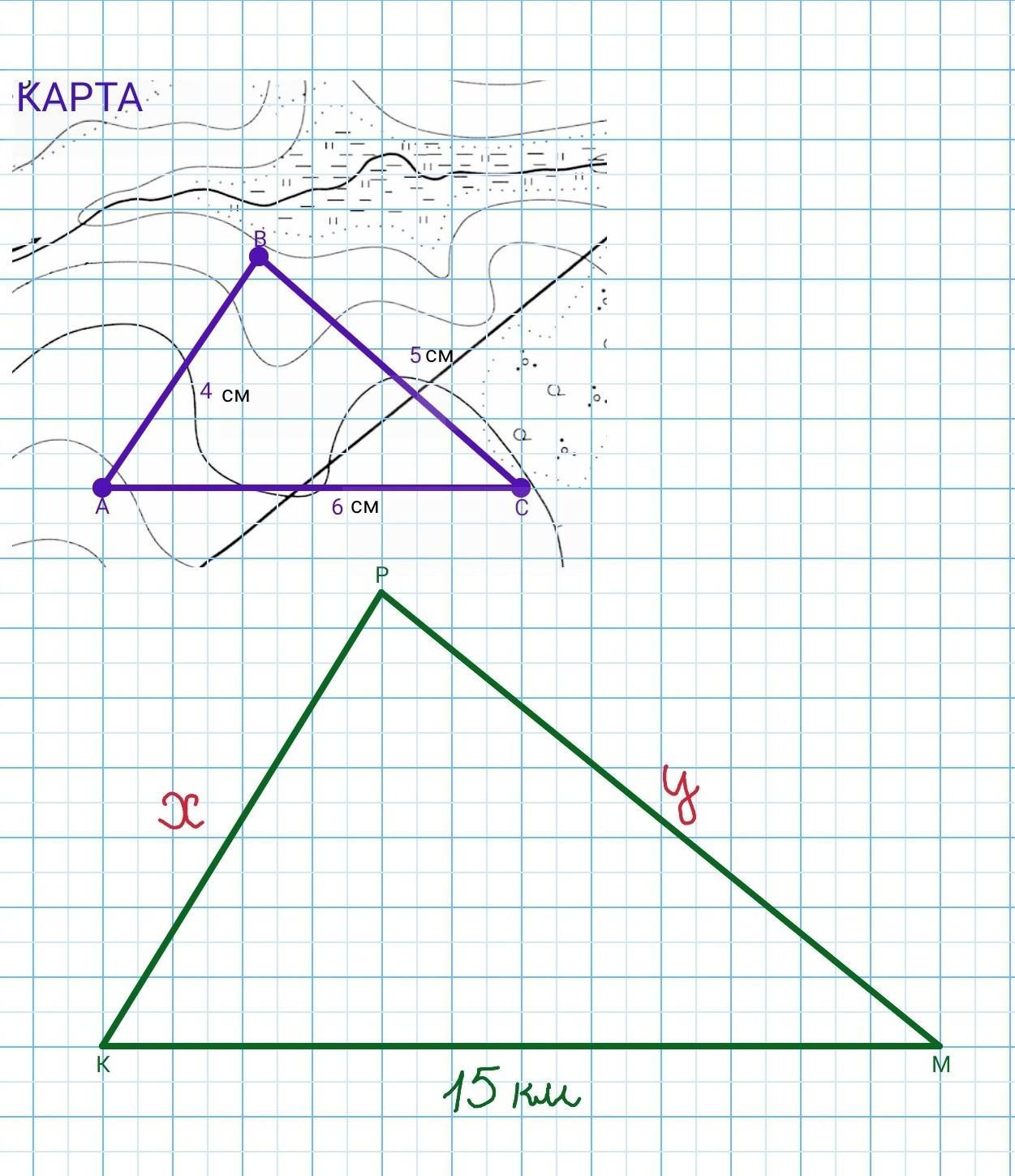 Нарисуем два подобных треугольника: △ABC - с расстояниями на карте, и △КРМ - с расстояниями на местности. Так как меньшей стороне одного подобного треугольника соответствует меньшая сторона второго, и наоборот: большей стороне одного соответствует большая сторона второго, то соответственные стороны у нас такие: АВ и КР, ВС и РК, АС и КМ.
