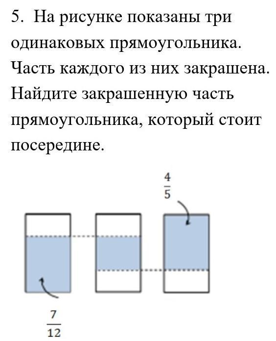 5. На рисунке показаны три одинаковых прямоугольника. Часть каждого из них закрашена. Найдите закрашенную часть прямоугольника, который стоит посередине.