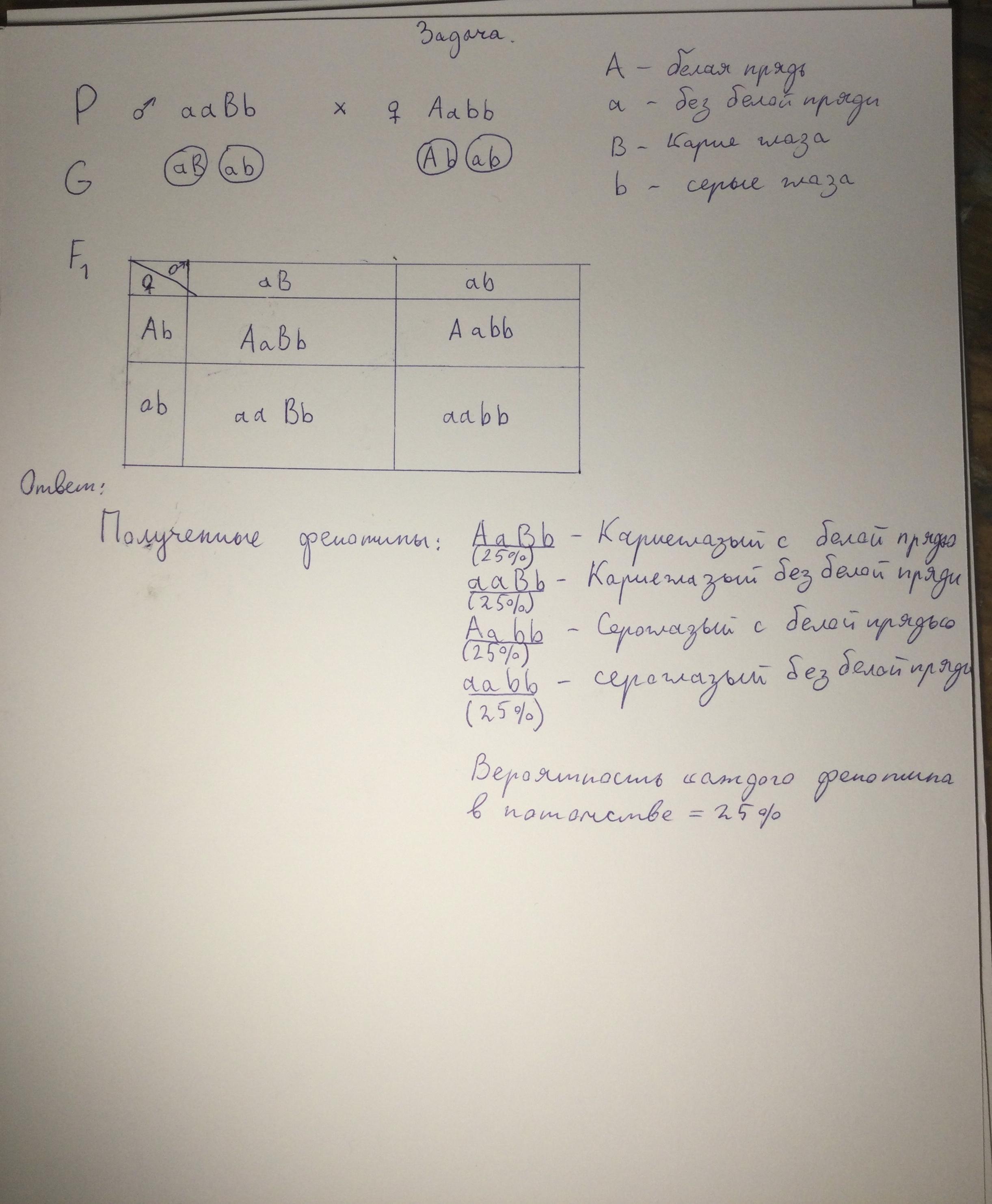 У человека белая прядь волос и карие глаза являются доминантными признаками, а отсутствие белого пряди и серые глаза - рецессивные признаки. Кареглазый юноша без белого пряди женился на сероглазой девушкой, которая имела белая прядь и была гетерозиготной по этому признаку. У матери юноши были серые глаза. Которые по фенотипу могут быть их дети
