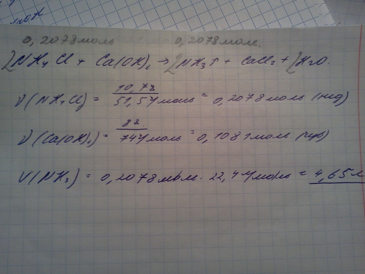 Вычислите объем (н.у.) аммиака,который можно получить при взаимодействии хлорида аммония массой 10,7 г и гидроксида кальция массой 8 г.Заранее спасибо:-)
