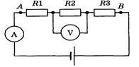 Полные сопротивления проводников, подключенных к источнику питания в трех цепях, составляют R1 = 5 Ом, R2 = 6 Ом, R3 = 9 Ом. Определите показания амперметра и вольтметра. Напряжение между точками A и B составляет 40 В.