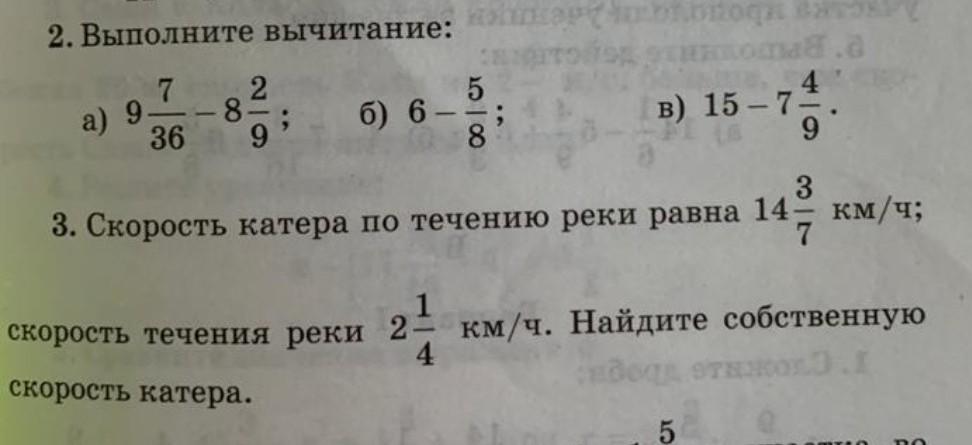 выполните вычитание:а) 9 7/36-8 2/9=? Б) 6-5/8=? В) 15 - 7 4/9=?срочно пожалуйста помогите