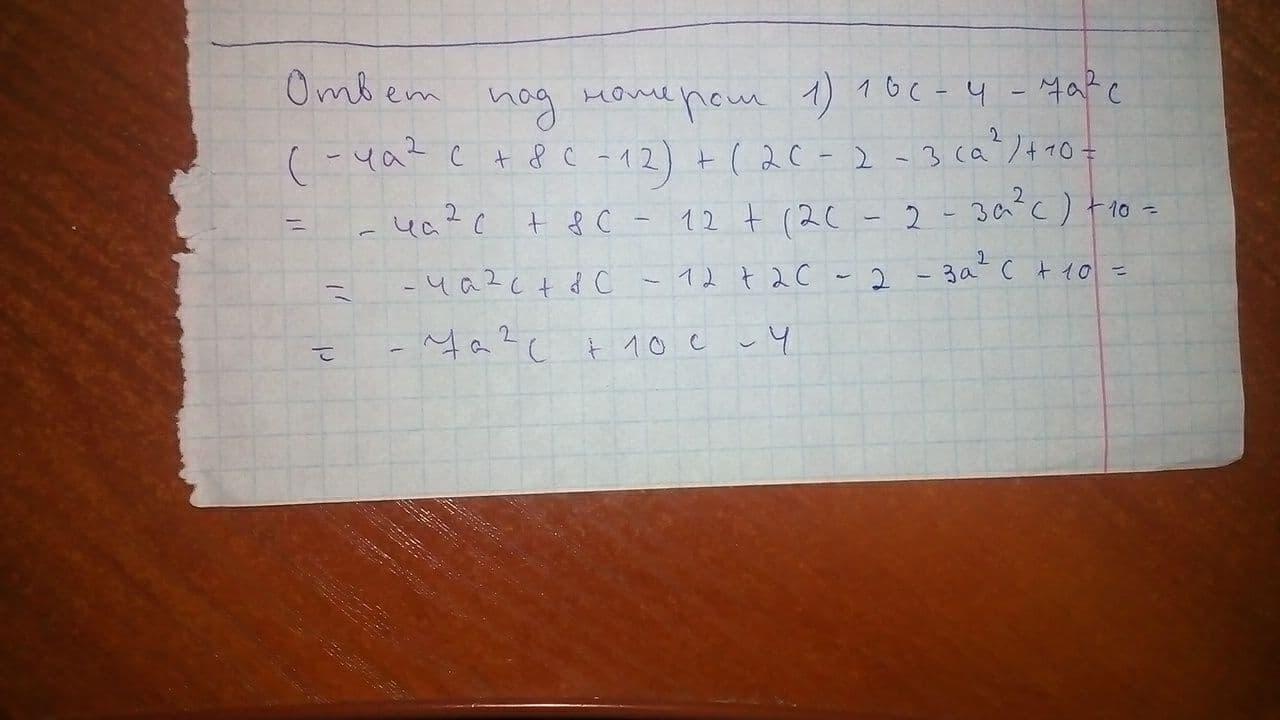 Выполните сложение многочленов: (-4a2c + 8c - 12) + (2c - 2 - 3ca2) + 10.