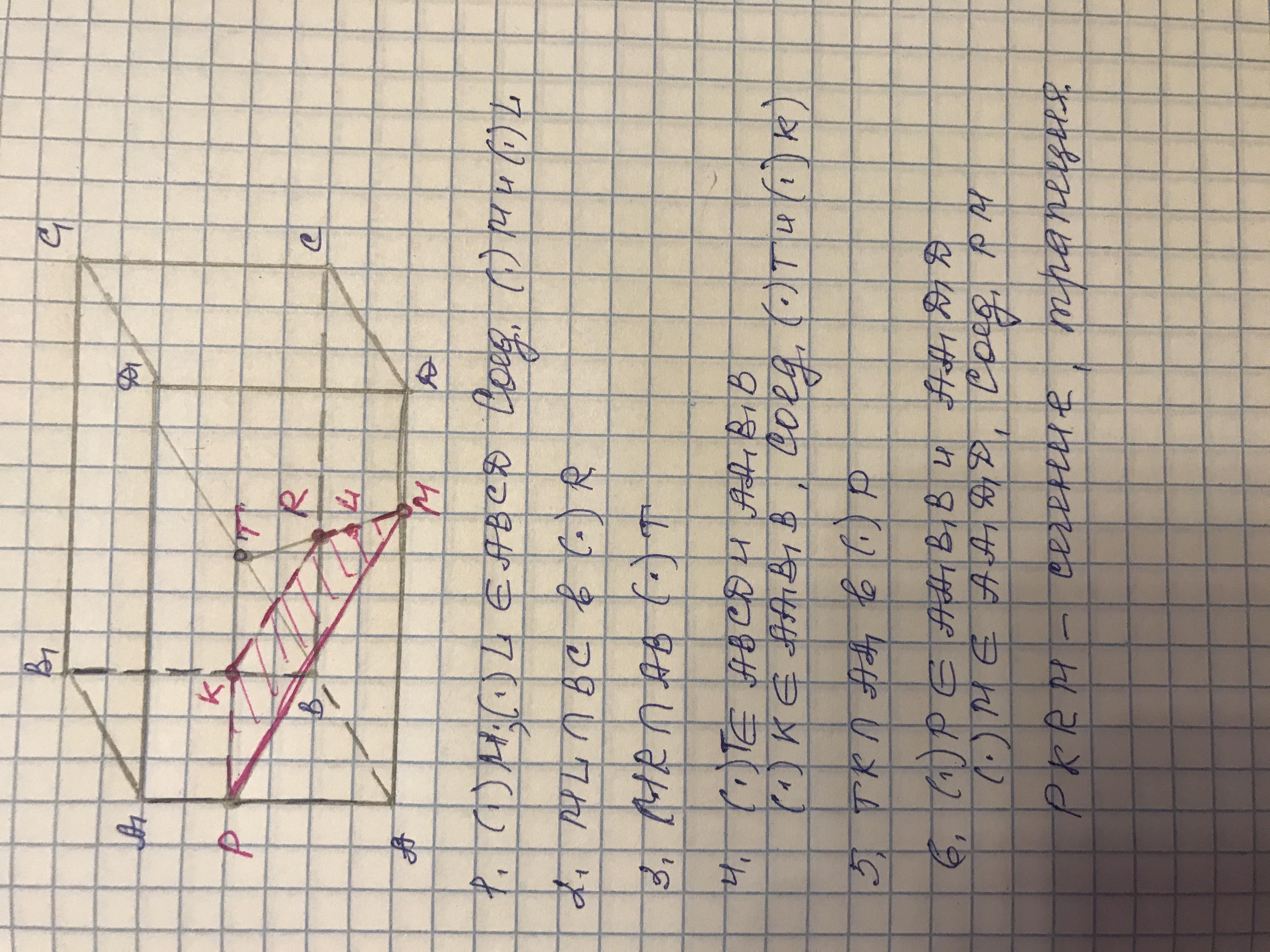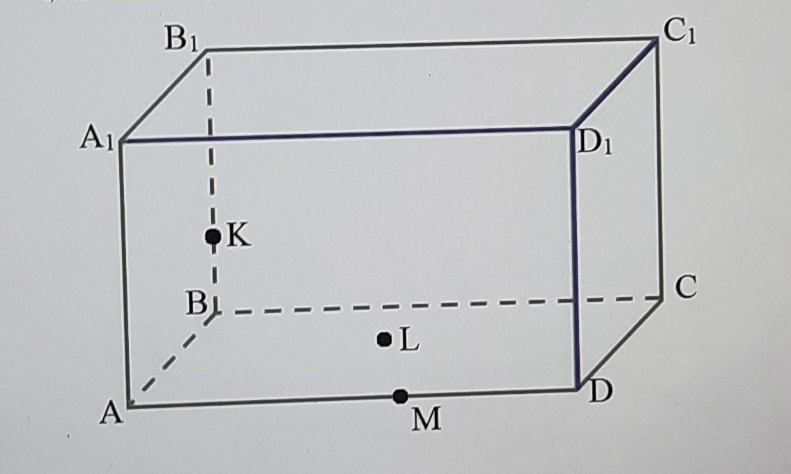 Постройте сечение параллелепипеда по 3 заданным точкам K, L, M. Объясните ход построения каждого из отрезков. Укажите название (вид) полученного многоугольника