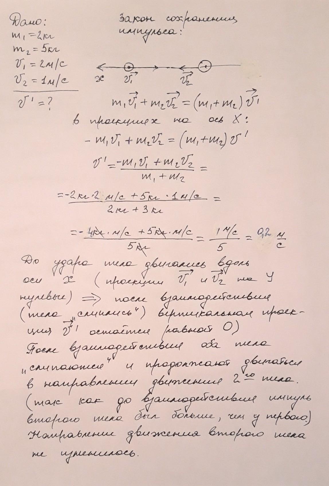 Два неупругих тела массами 2 и 5 кг, движутся навстречу друг другу со скоростями 3 и 1 м/с соответственно. Определите модуль и направление скорости каждого тела после удара.
