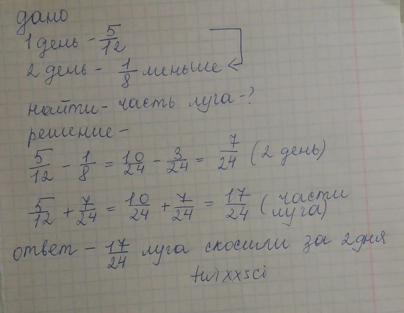 в первый день почистили от снега 5/12 всей дороги а во второй день на 1/8 меньше чем в первый какую часть дороги почистили за 2 дня