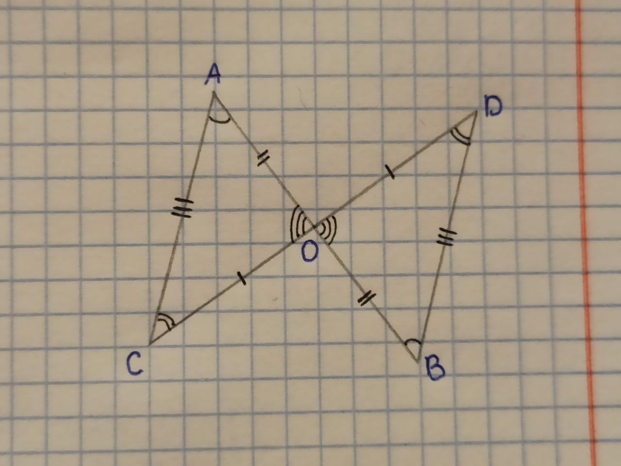 Отрезки АВ и СD пересекается в середине точке О. Запишите равные элементы треугольников ACО и ОBD и определите, по какому признаку треугольники равны.