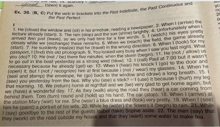 closed, sat, arrived, started, has stopped, shined, left, watched, exchanged/, reached, started, realized, traveled, looked, found, did, wasn't, began, didn't allow,, was blowing, called, got up, heard, went, opened, haven't recognized, wasn't wearing, sealed and stamped, went, drew, saw, used, used, hurt, returned, were, had, walked, heard, turned, held, stopped, arrived, was waiting, was wearing, looked, saw, was painting, was watering, began, was saying, took, said, worked, wanted