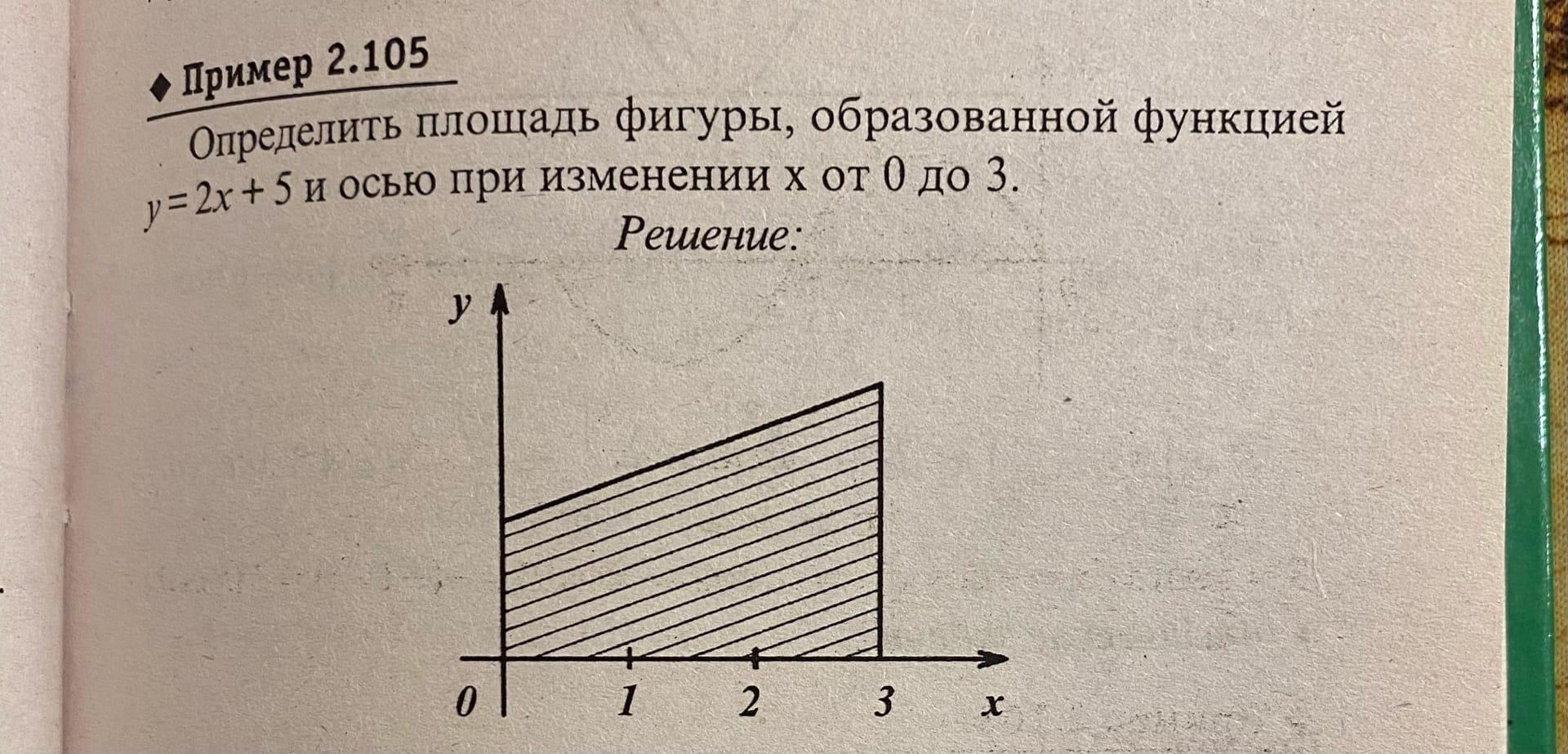 Определить площадь фигуры , образованной функцией у=2х+5 и осью при изменении х от 0 до 3. (При помощи интеграла)
