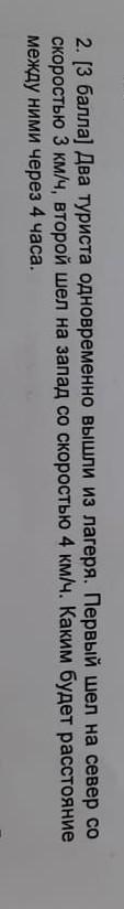 Направления север и запад - катеты прямоугольного треугольника, 3*4=12 км - длина одного катета, 4*4=16 км - длина другого катета. Расстояние между их концами - гипотенуза. По т. Пифагора - √(12²+16²)=20 км - расстояние между туристами через 4 часа.