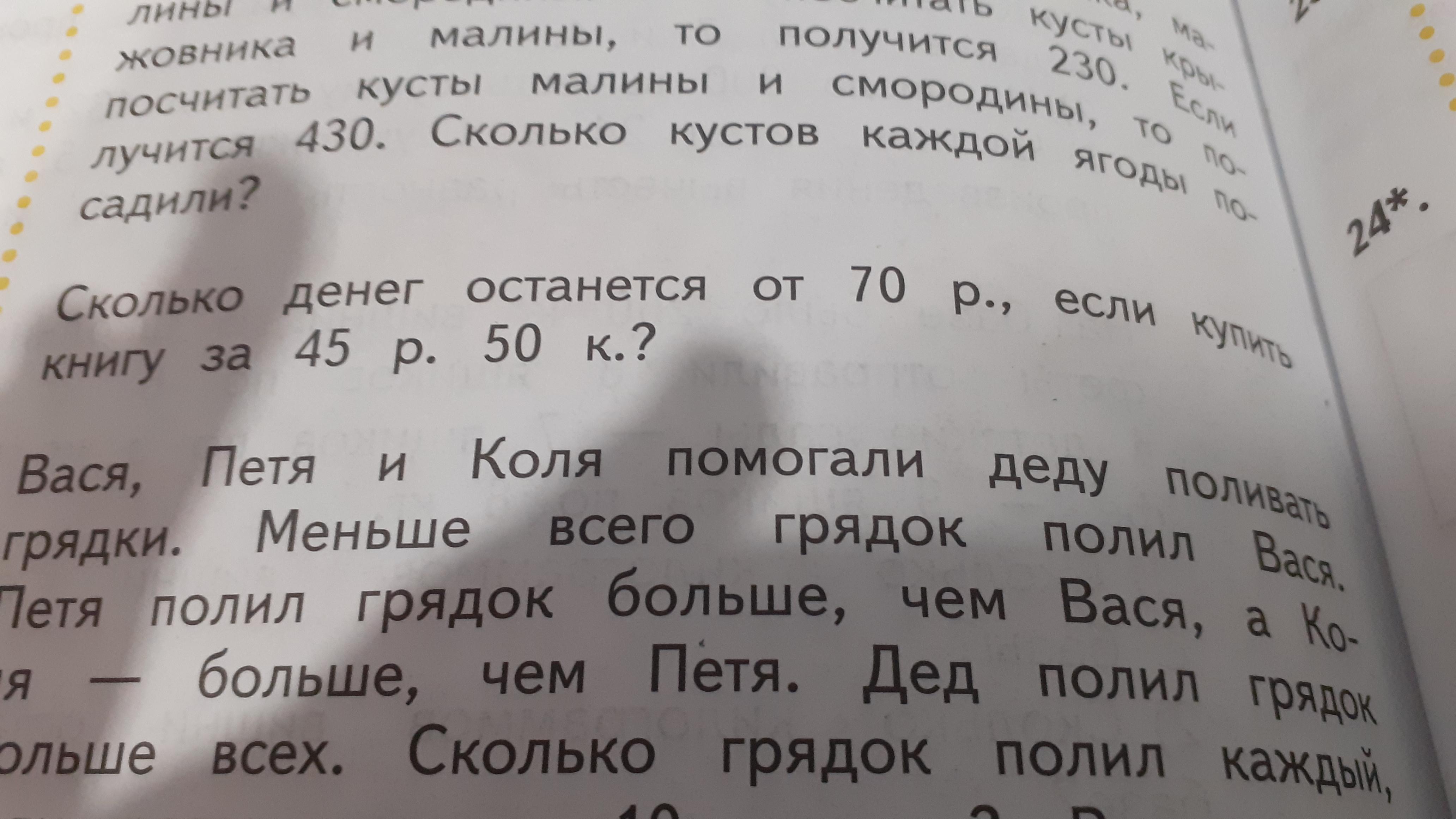 Сколько денег останется от 70 р., если купить книгу за 45 р. 50 к.?