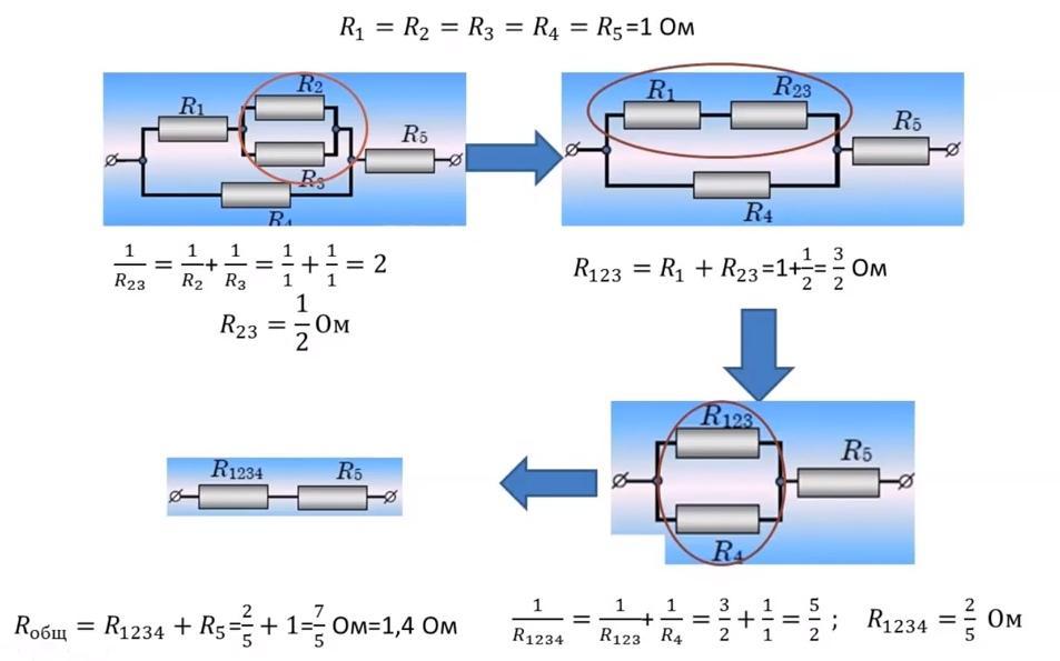 R₁₂=R₃₄=R₁+R₂=R₃+R₄=2 Ом;