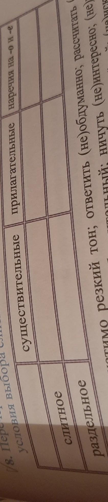 Перечертите таблицу в тетрадь. Заполните её примерами, обозначая в них условия выбора слитного и раздельного написания *не*