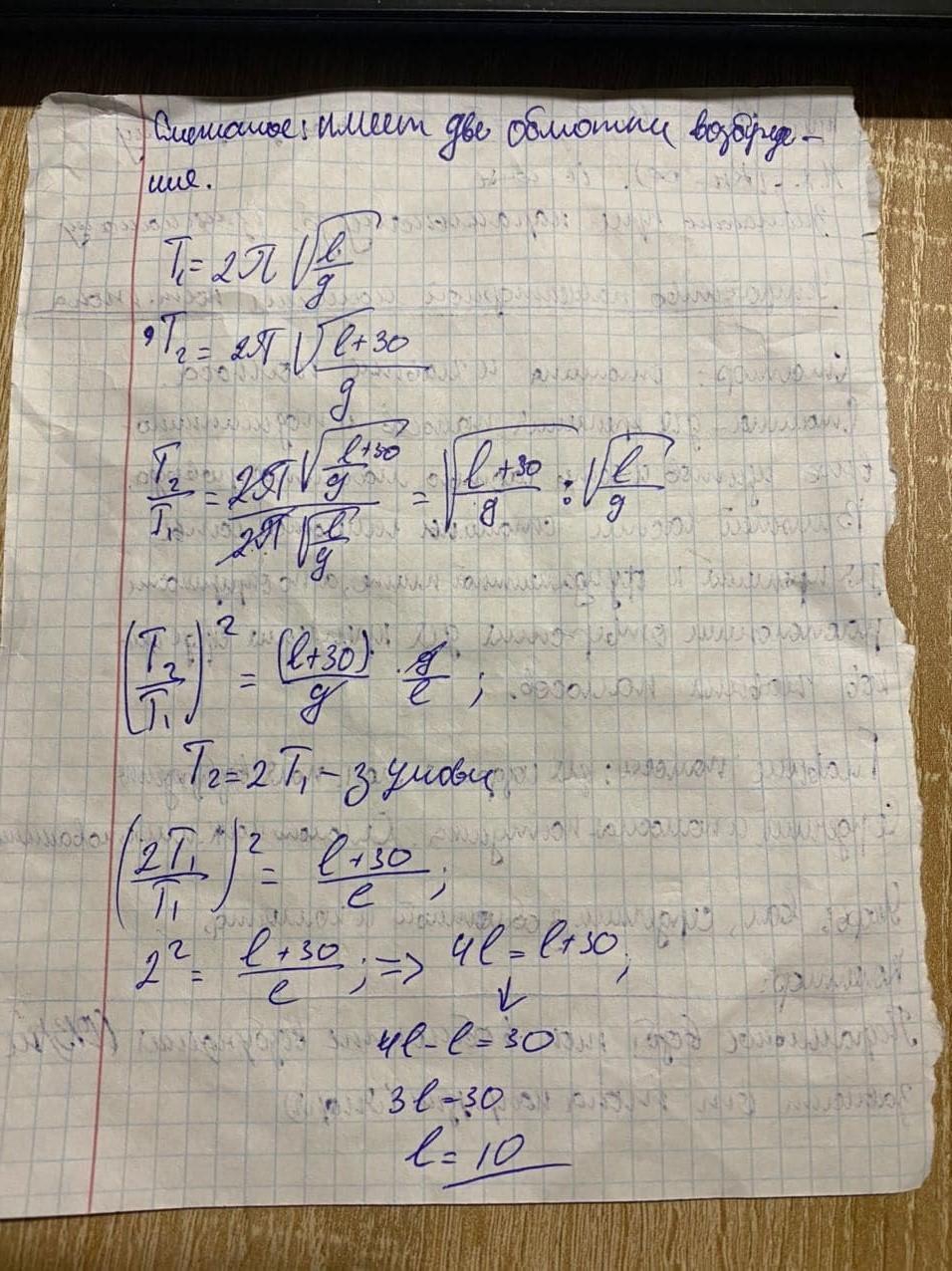 Якої довжини був математичний маятник,якщо період його коливань змінився вдвічі після того, як маятник подовжили на 30 см?