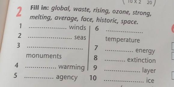 Fill in: global, waste, rising, ozone, strong, melting, average, face, historic, space. winds 30 баллов