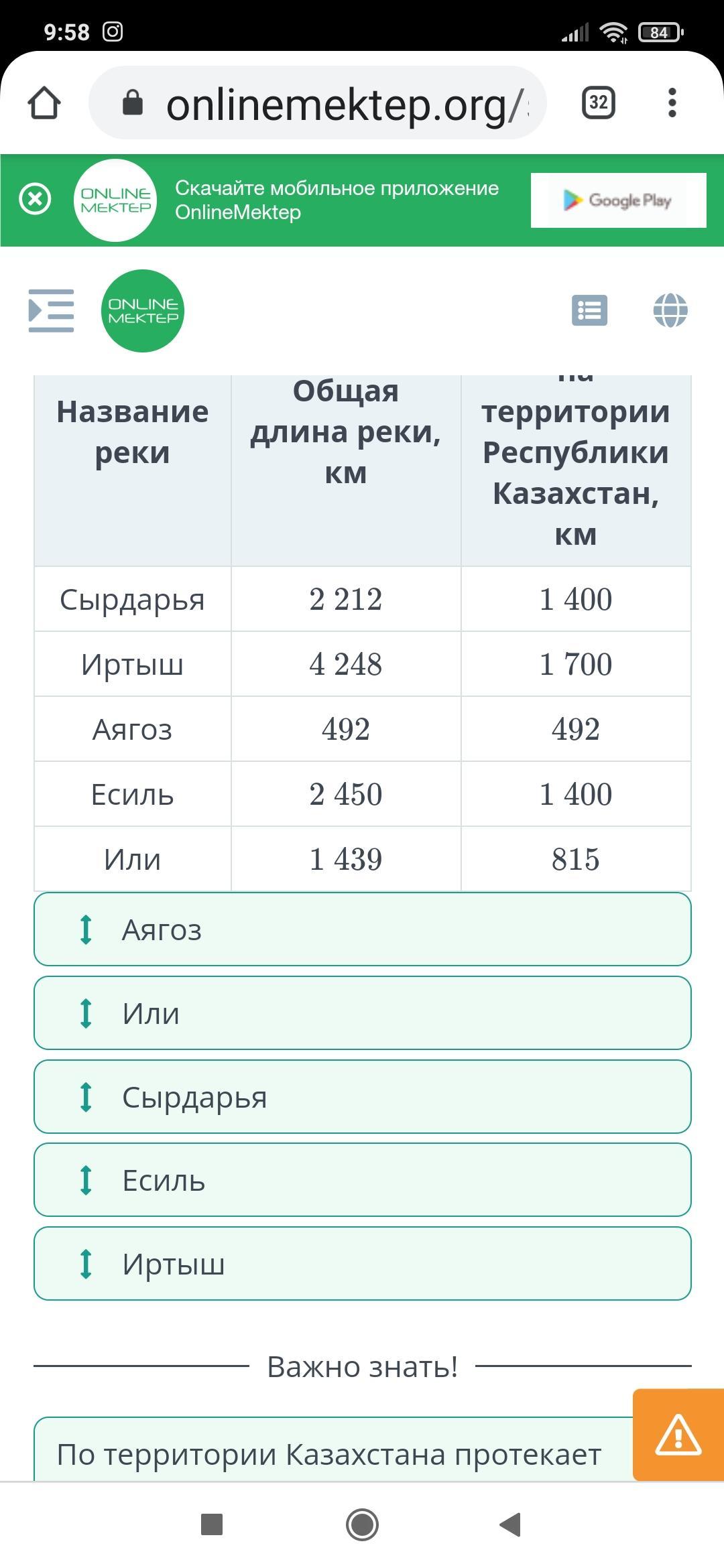 третьеклассники изучали природные источники воды Республики Казахстан реки помоги расположить названия рек в порядке возрастания сверху вниз