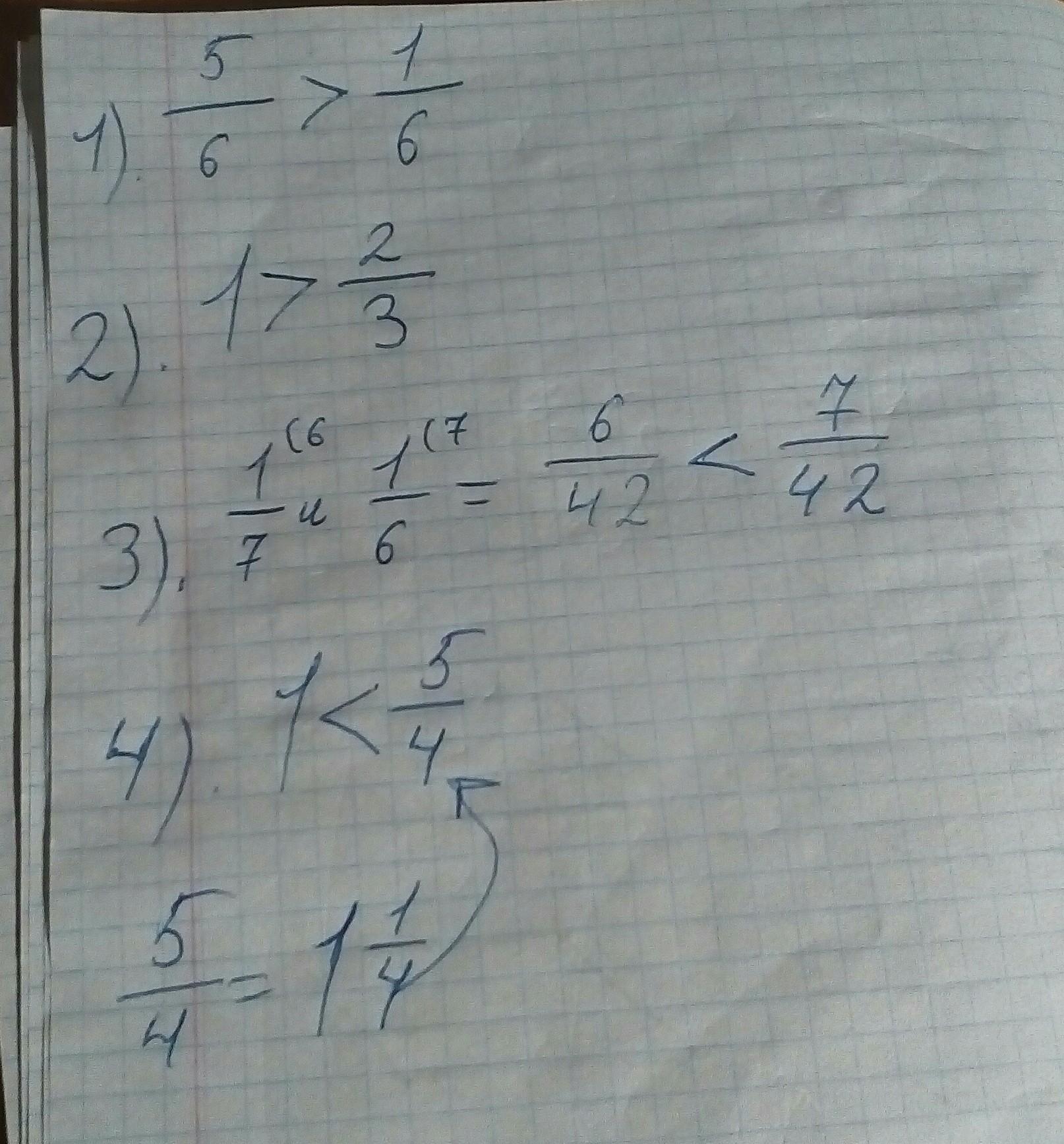 Решение во вложении........В 4-ом примере 1<5/4. Потому что любая неправильная дробь больше единицы.
