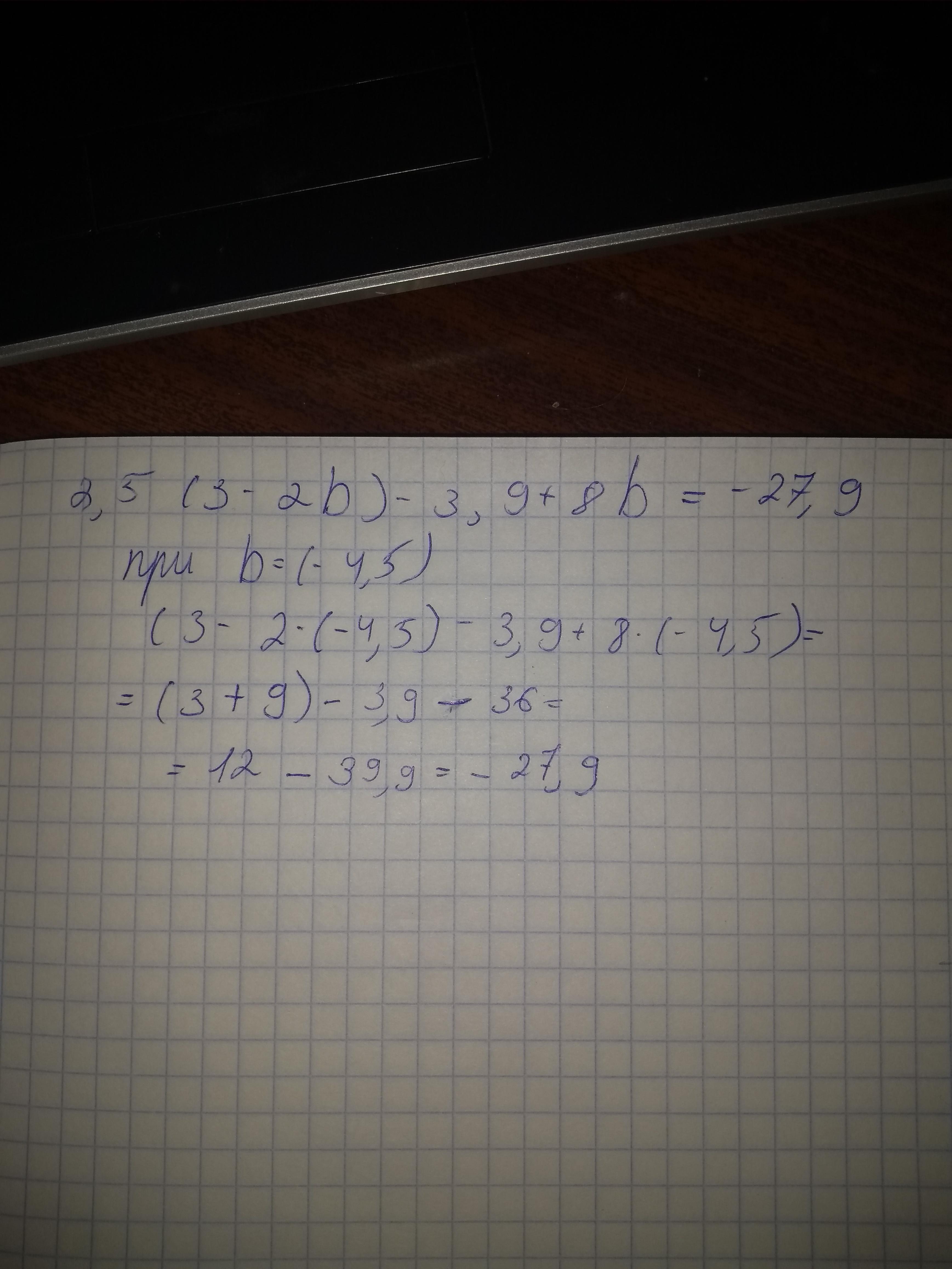 2,5 · (3 – 2b) – 3,9 + 8b при b = (- 4,5)