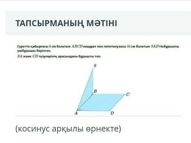 На рисунке показан квадрат ABCD со стороной 6 см и прямоугольный треугольник SAB с гипотенузой 10 см. Найдите угол между линиями SA и CD.