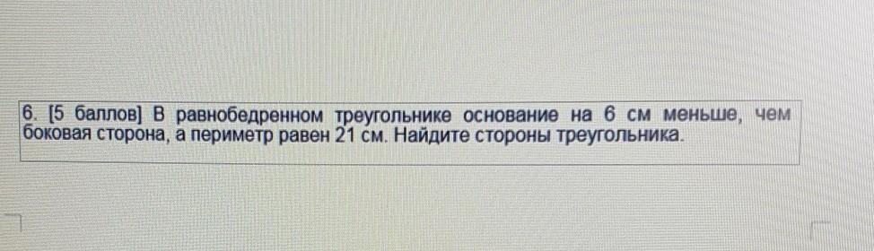 6. [5 баллов) в равнобедренном треугольнике основание на 6 см меньше, чем