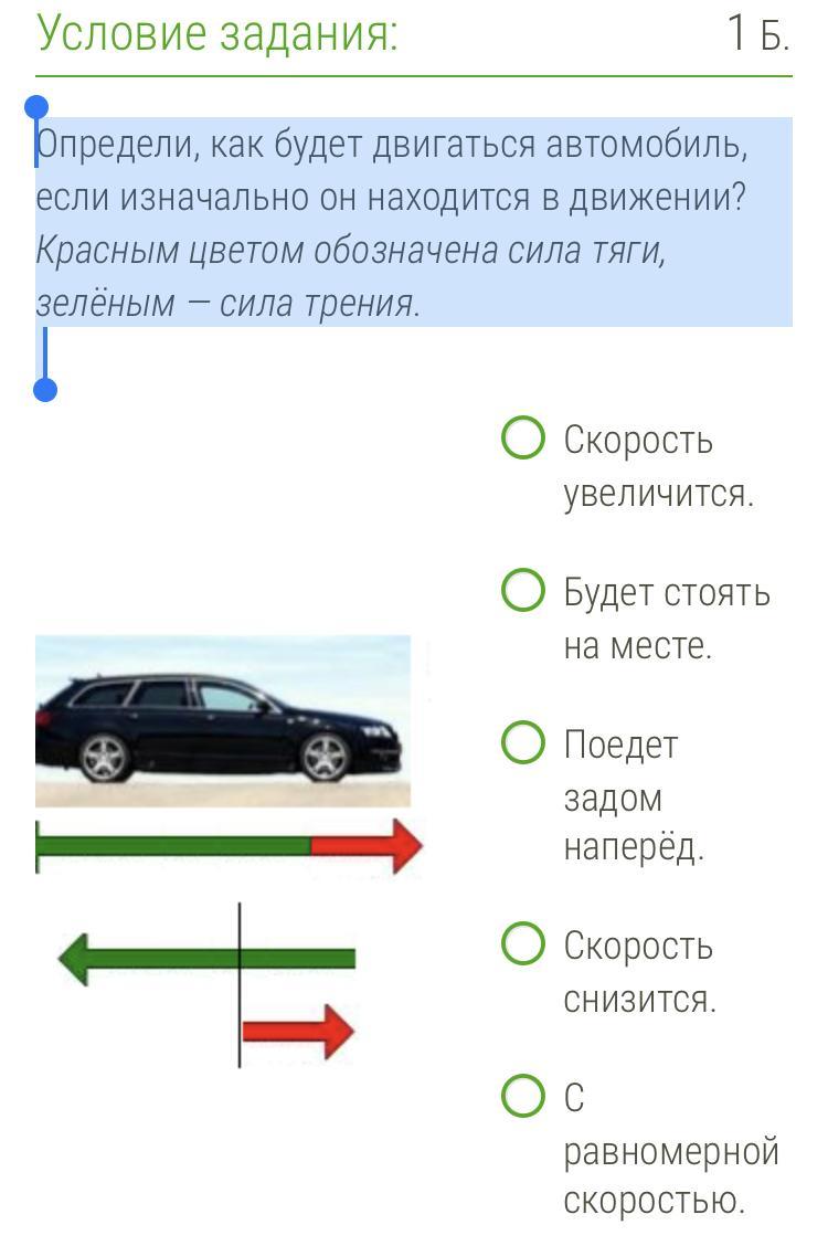 Определи как будет двигаться автомобиль если изначально он находится в движении ? Красным цветом обозначена сила тяги , зелёным сила трения. Срочно!!!!