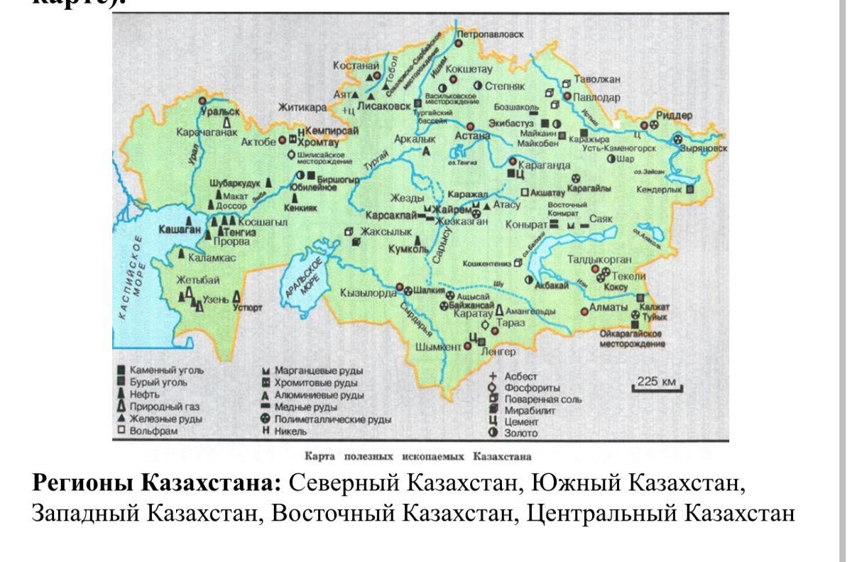 Изучите карту полезных ископаемых Казахстана и найдите: