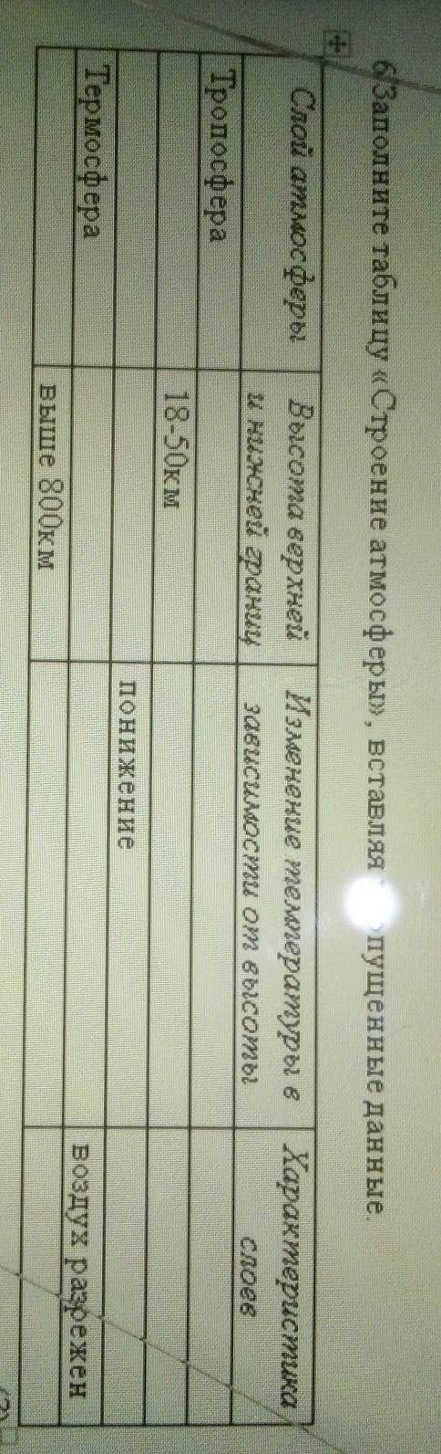 6 Заполните таблицу «Строение атмосферы», вставляя пропущенные данные
