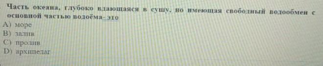 ответ B, так как залив - это часть водоёма, глубоко вдающаяся в сушу, но имеющая свободный водообмен с основной частью водоёма.