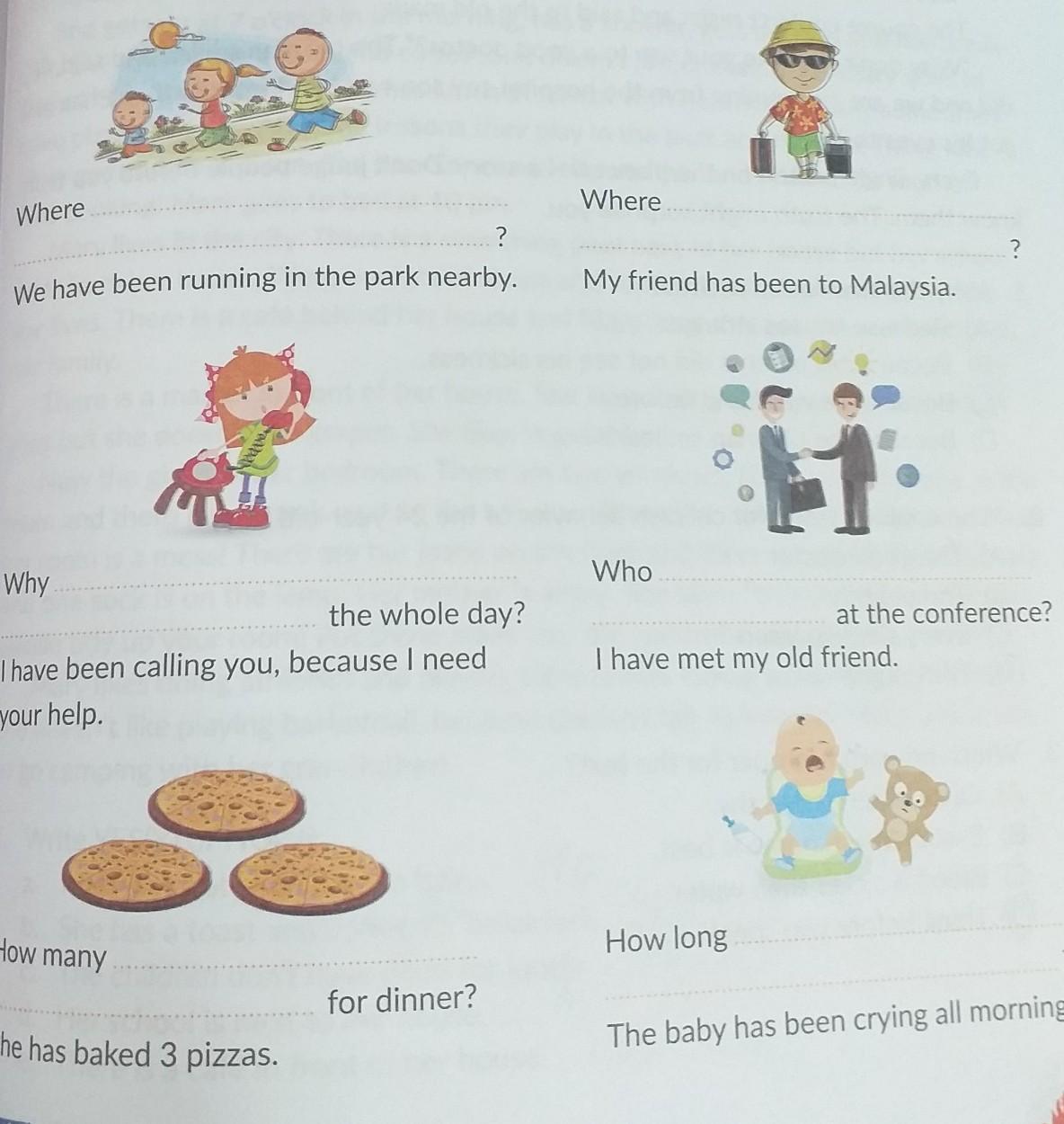 Where have you been?: Where has your friend been?;Why have you been calling me the whole day?;Who have you met at the conference?;How many pizzas has he baked for the dinner?;How long has the baby been crying?