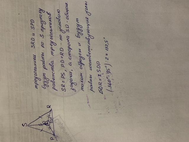 Точка D лежит внутри ∆ PRS. Найдите угол RDS, если RS=PS,DP=DR,угол RDP=95°
