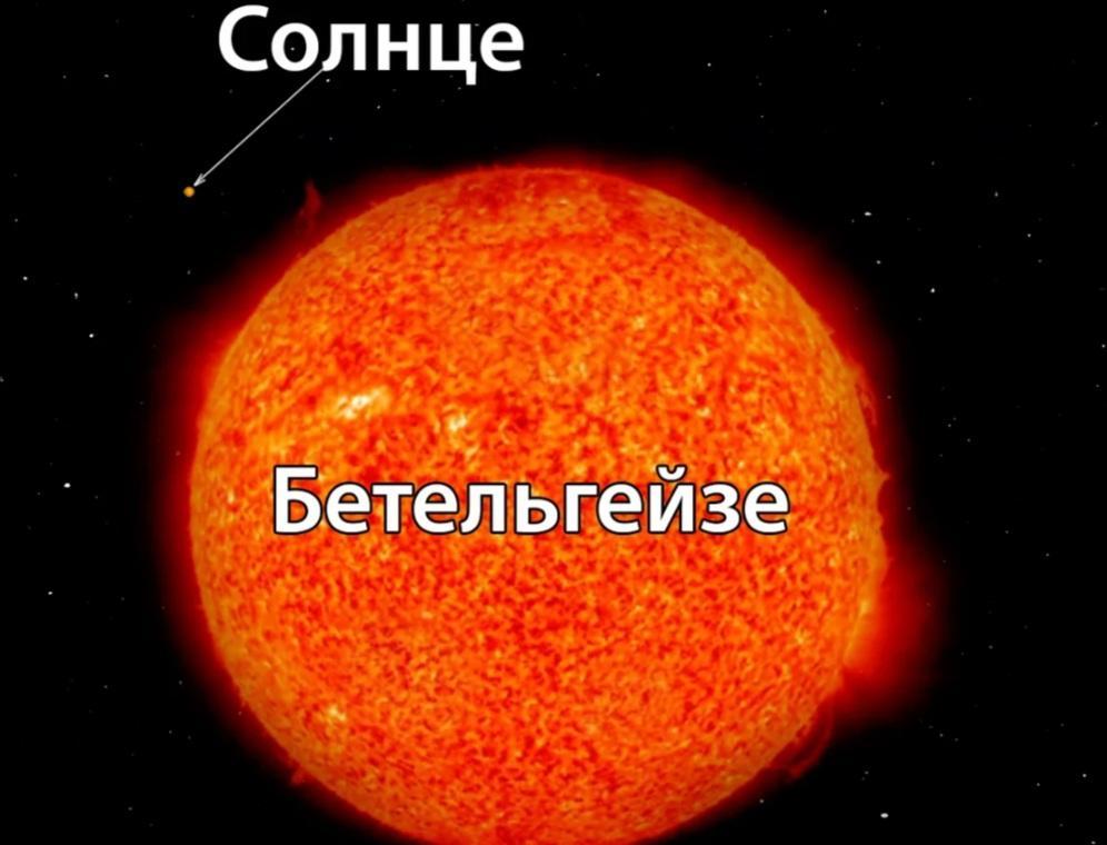 На изображении заметно, что звезда Бетельгейз в 100 раз, а то и более раз больше, чем Солнце. Сразу можно сказать, что данная звезда старше Солнца...