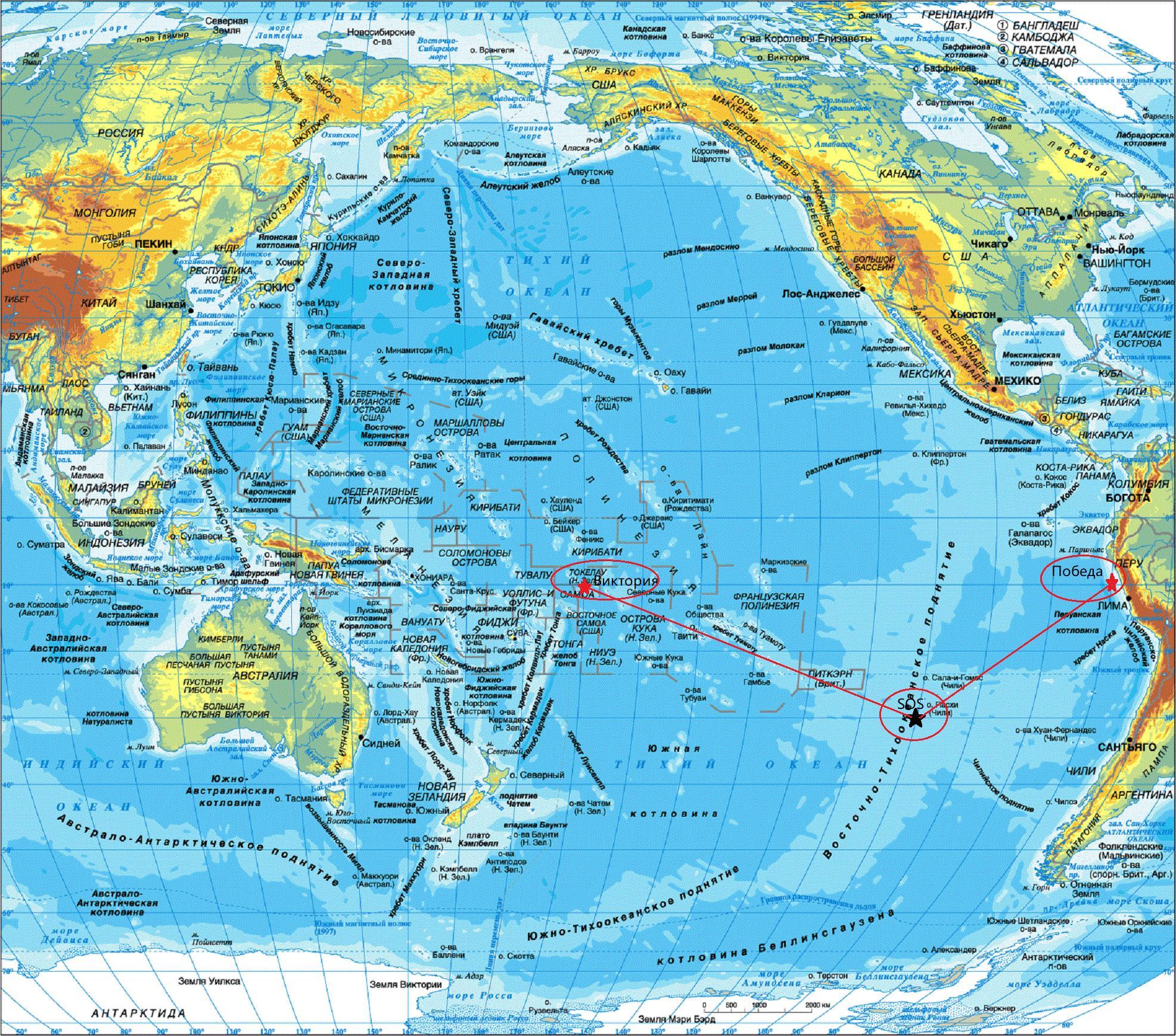Корабль, который находится в точке 30° ю.ш. 110° з.д., потерпел крушение. Радист передал сигнал «SOS» с координатами своего судна. В район бедствия направились 2 корабля «Победа» (координаты 10° ю.ш. 80° з.д.) и «Виктория» (координаты 10° ю.ш. 170° з.д.).