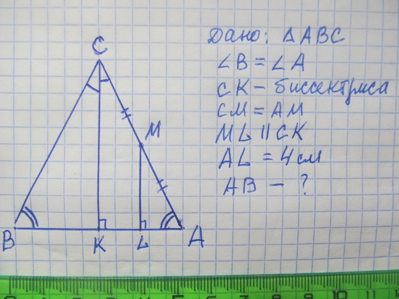 В треугольнике АВС углы ВАС и АВС равны. Из середины стороны АС проведена прямая параллельная биссектрисе СК. Она пересекает сторону АВ в точке L. AL=4см. Найдите АВ. (4б.)