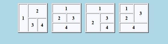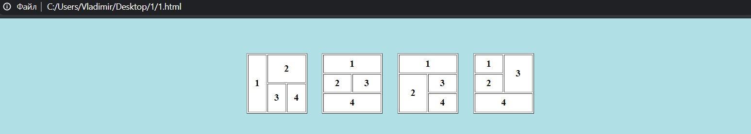 Напишем 4 таблицы на html, теги будем писать в html файле, и стили тоже, а не в css, где пишут стили. Создадим папку с названием "1", и html файл с названием "1" (для html файла пишем 1.html). Пусть все квадраты будут с размерами 100 px на 100 px. Тогда: