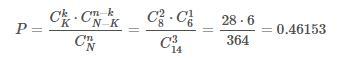 В урне 8 белых и 6 черных шаров. Из урны вынимают сразу 3 шара. Найти вероятность того, что два из них будут белыми, а один – черным.