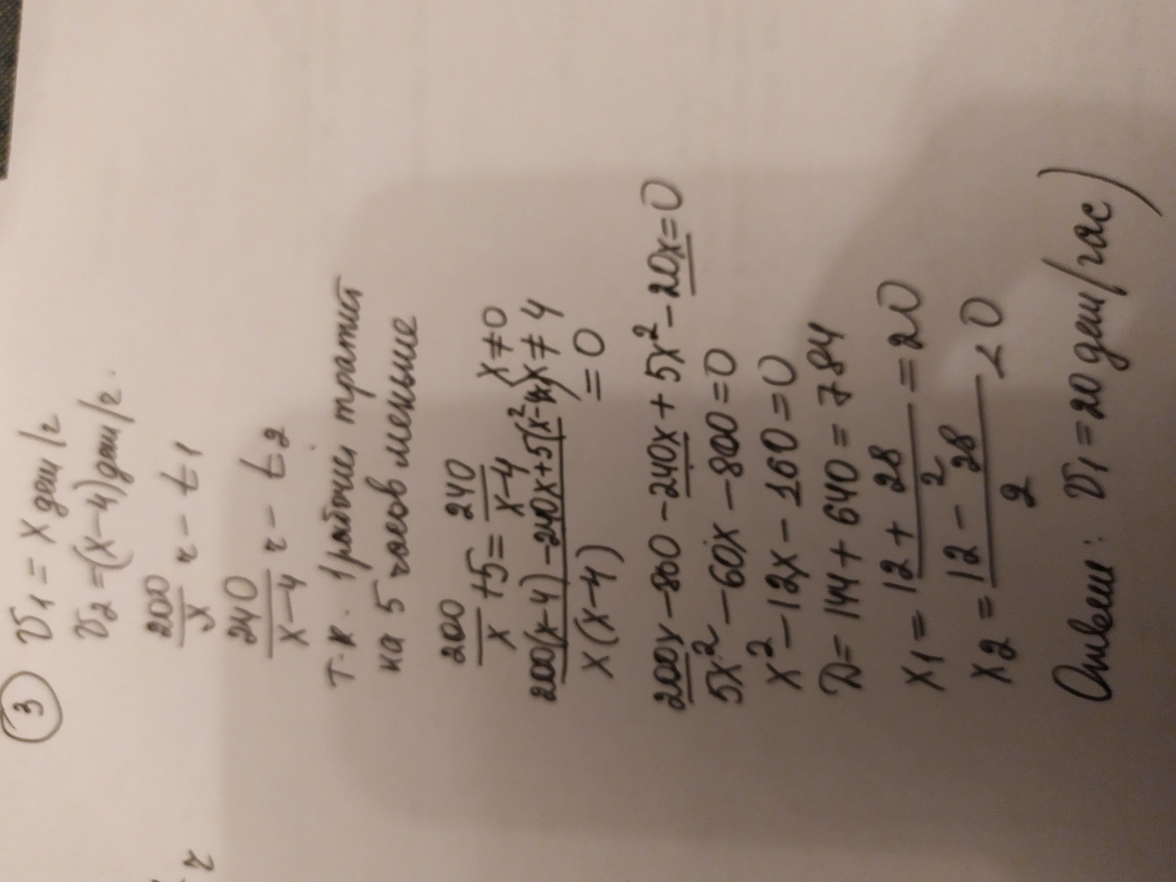 3)На изготовление 200 деталей первый рабочий тратит на 5 часов меньше, чем второй рабочий на изготовление 240 таких же деталей. Известно, что первый рабочий за час делает на 4 детали больше, чем второй. Сколько деталей в час делает первый рабочий?