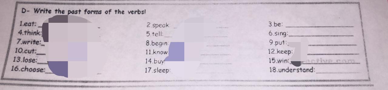 eat. think . write. cut. lose. choose . speak. tell. begin. know. buy. sleep. be. sing. put. keep . win. understand