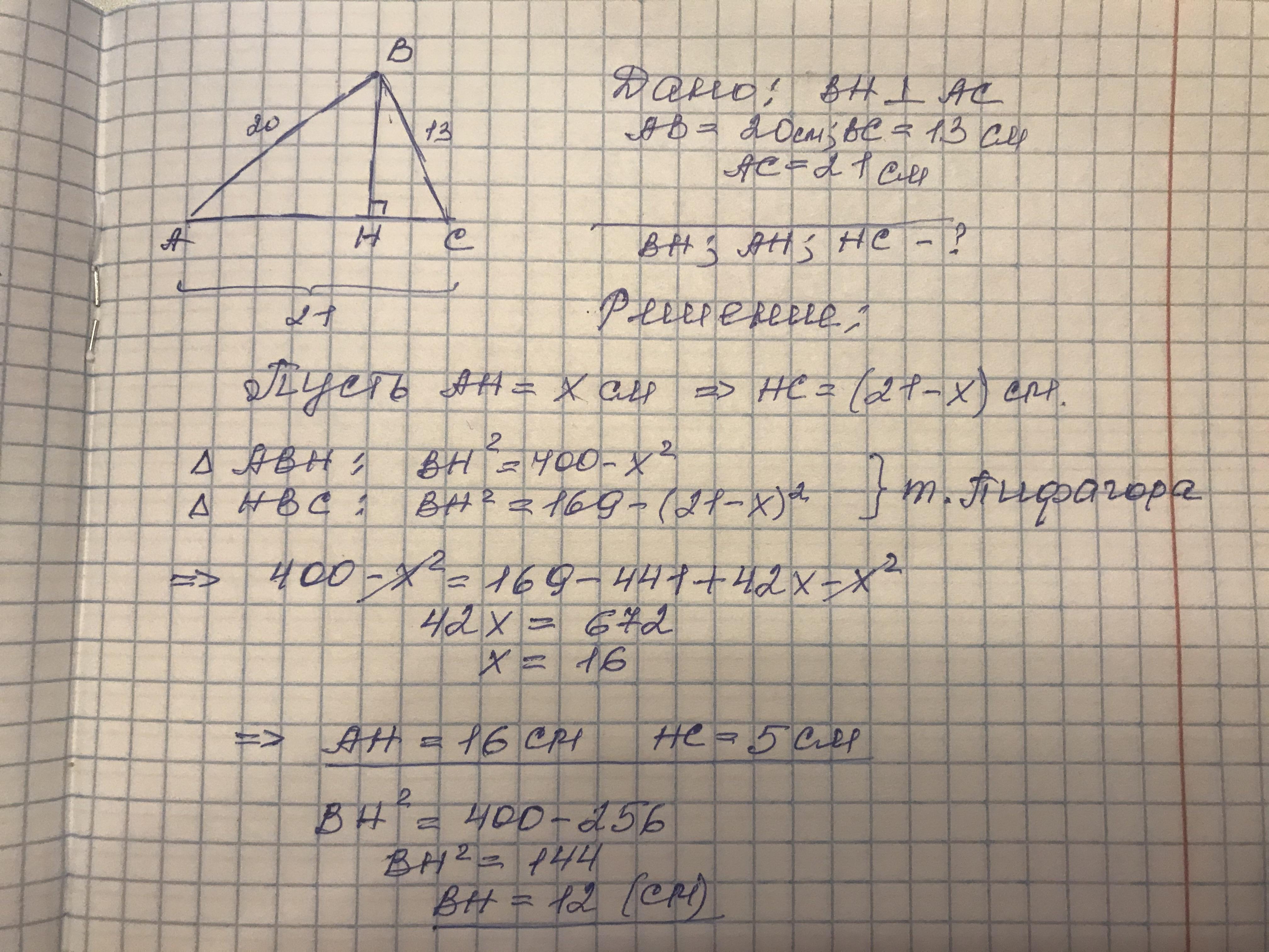 наклонных равны 20 см и 13см. Найти длину перпендикуляра и проекций наклонных.