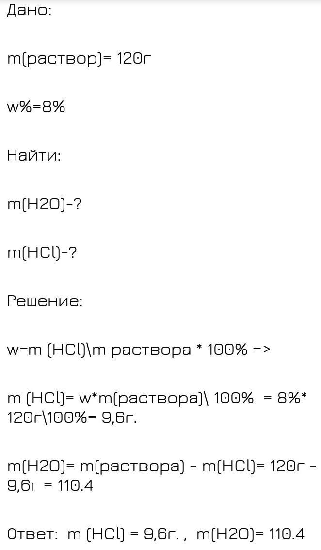 сколько граммов воды и соляной кислоты нужно взять, чтобы приготовить 120 граммов раствора с массовой долей соляной кислоты 15%?