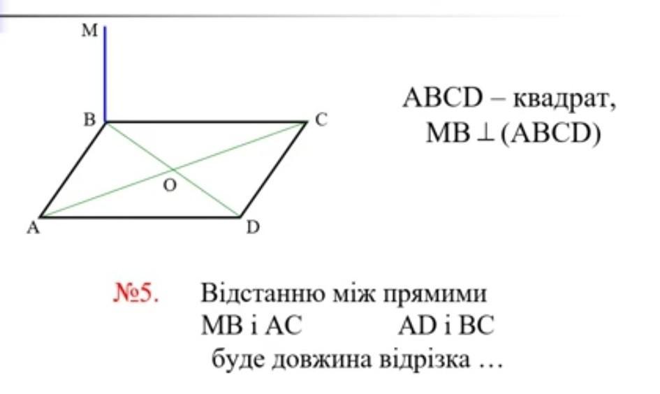 1) Расстояние между скрещивающимися прямыми МВ и АС равно длине отрезка их общего перпендикуляра.